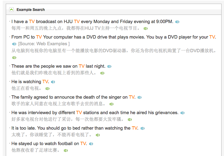 也许这本词典最大的特点是,你不仅能看到你正在查找的单词的定义和翻译,而且你还能得到大量如何在句子中使用该单词的例子。以搜索“TV”为例: