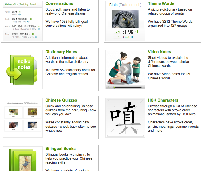 这是nciku与其他在线词典的区别所在。浏览该网站的这一部分,你可以阅读对话、查看主题词列表、观看动画短视频笔记、做测验、学习HSK汉字,甚至阅读双语书籍。