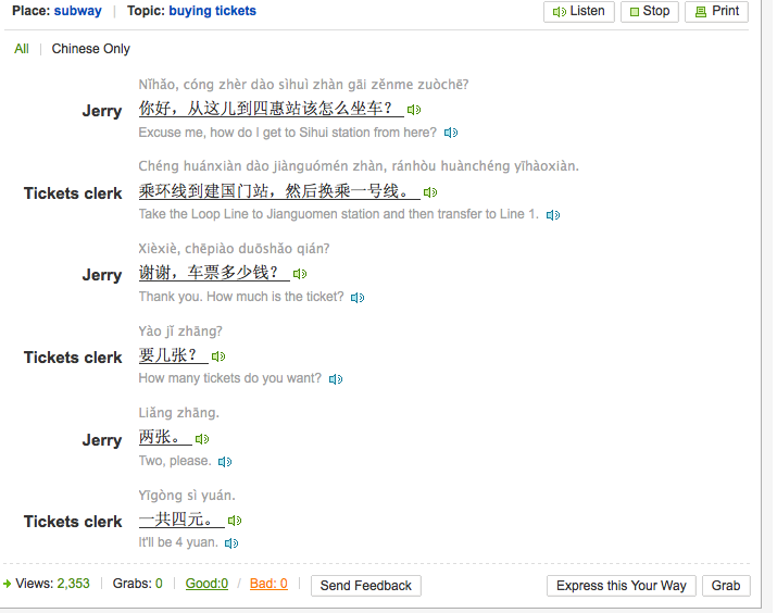 对于对话,您可以按地点或主题浏览。例如,在“买票”主题下,您可以查看在电影院、地铁站、公园等地的对话。当您查看对话时,您可以选择打开/关闭英语。这是一种很好的练习方法,因为你可以带英文读一遍,然后不带英文再试一遍。你可以同时听中文和英文。对话可以保存或打印以供进一步研究。