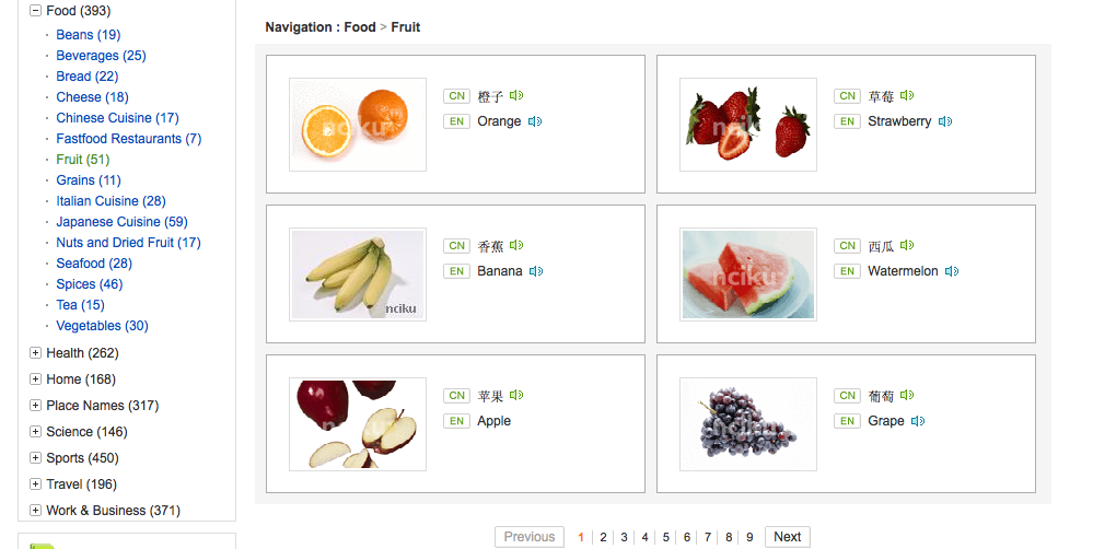 主题词是nciku的另一个有用的方面。按类别浏览,然后查看相关的单词列表。你会在这个单词的中英文版本旁边看到一张图片,你可以同时听两种版本。举个例子,你想学一堆关于水果的中文单词,这样你就可以去杂货店购物了——只要在“食物”下搜索,你就会找到一个超过50个单词的列表。